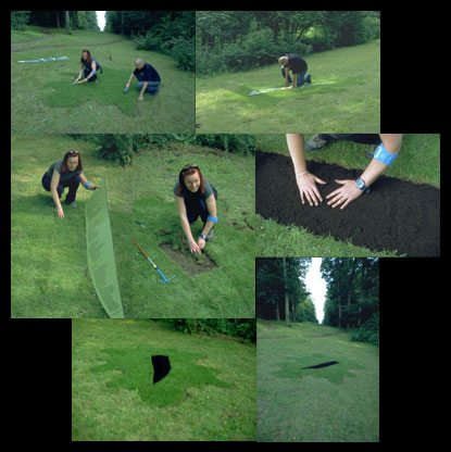 In amorpher Form entfernen wir ein Stück der Wiese in der erwähnten historischen Blickachse, die den "Park an der Ilm" auch auf dem Gelände der "Künstlergärten Weimar" durchzieht. An dieser Stelle legen wir dicht gewachsenen Rollrasen aus. Als der Rasen angewachsen ist, wird in Form des Berliner Geländes ein Stück aus dessen Mitte herausgeschnitten. Für das Ausstechen verwenden wir die Schablone. Anstelle des Rasens sieht man nun die bloße Erde, die gejätet und gerecht wird. Mit frischer Erde aufgefüllt erhält die Fläche eine dunklere Färbung, die den Kontrast zum Rasen erhöht. Die Rasenfläche um das ausgestochene Stück herum soll so dicht und fein wachsen, daß sie auf Dauer durch ihr hellgrünes Leuchten diesen besonderen Kontrast zur dunklen Erde beibehält. Der erste Schnitt mit der Schablone, den wir in der Blickschneise vornehmen, wird aufgezeichnet und das Dokumentationsmaterial dem Archiv der "Künstlergärten Weimar" zur Verfügung gestellt.