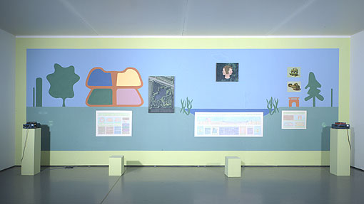 Ein "Transformer" ist ein beliebtes Kinderspielzeug, das seinem Bauplan nach die unterschiedlichsten Gestalten annehmen kann. Ein Raumschiff, ein Vogel, ein Weltraum-Ritter, ein Gefährt - je nach Drehung der Einzelteile erscheint eine andere Figur. Wir haben das Projekt, das wir auf dem "Falster Versuchsgelände" bearbeiten, "Die Dritte Kammer - Transformer" genannt, weil es zwei Bereiche "Der Dritten Kammer" fusioniert, die innerhalb unserer systemischen Konfiguration zwei wichtige Pole bilden. "Überwindung der Kenntnis" steht für den Bereich der utopischen Erfindungen, deren Realitätsgehalt von Vorgriffen auf die Zukunft stark gedehnt wird. "Das begehbare Bild" steht unter anderem für den Bereich der Arbeiten auf realem Gartenboden. Diese beiden Pole werden auf der zweiten Wandinstallation als Querschnitt anschaulich. Links des Sees befinden sich die Bezüge zum "Haus des Idealen Gärtners", als dem Ort des Fiktiven und als Projektionsfläche für das Utopische. Rechts des Sees werden Details zur späteren Realisierung der "Bank des Idealen Gärtners" verbildlicht. Der See selbst - als Fläche der Reflexion - spiegelt fiktive und reale Erscheinungen auf dem Gelände sowohl von links nach rechts als auch von oben nach unten. |