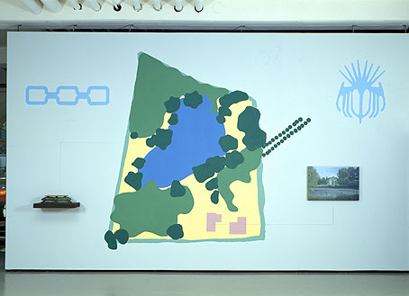 Diese komplexe Verschränkung von Vorstellung und Realität bringen wir in der Ausstellung "Falster Versuchsgelände der Galerie für Landschaftskunst" im Kasseler Kunstverein auf zwei großen Wandinstallationen zur Darstelllung. Die erste Wandinstallation verschafft in stark schematisierter Form einen Überblick über das gesamte Versuchsgelände und bestimmt grafisch die Standorte von Bank und Bild, die wiederum als Modell und als es selbst in Erscheinung treten. Da es unser Anliegen ist, der Malerei aus dem Garten heraus einen Erneuerungsimpuls zu geben, verwenden wir das "Falster Versuchsgelände" als gartentechnische Modellsituation, in der wir Konstellationen vorfinden, die an Historisches gemahnen, ohne es zu sein. Diese Referenzpunkte setzen wir punktuell als Projektionsfläche für unser spezifisches Konzept ein.