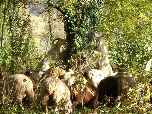 Der Wanderschäfer Theo Burbach war im Oktober 2002 mit einer Mischherde aus einer Vielzahl an Schaf-und Ziegenrassen auf dem Gelände des Hentzenparks. Gemeinsam steckten wir mit ihm mobile Elektrozäune in Etappen so ab, dass sie jeweils eine amorphe Form ergaben. Diese Zäune verstehen wir als Gestaltungsmittel, um dem Park eine lebendige Wachstums-Entwicklung zu ermöglichen. Die Herde aus 250 Tieren fraß innerhalb der abgesteckten Zaungrenzen in 4 Tagen die gesamte Krautschicht so radikal ab, dass die von uns gesteckten Formen offensichtlich zutage trat. Da die Beweidung sich so erfolgreich als Gestaltungsmittel erwies, entschlossen wir uns, die Hauptpflege des Gartengeländes den Schafen und Ziegen einmal jährlich zu überlassen. Mit Hilfe der mobilen Elektrozäune kann man die Bereiche ausgrenzen, die eher zuwuchern sollen und diese Maßnahmen jährlich ändern. Die Nachpflege des Gartens wird dann auch der Schäfer in Zukunft übernehmen, sodass in seinen Händen - immer nach Rücksprache mit uns - fast der ganze gestalterische Part liegen wird.