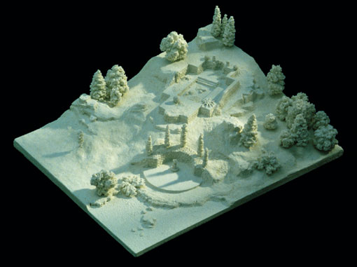 Dem Modul einer Orbitalstation vergleichbar schwebt das Modell durch die Schwärze des Raumes. In seinem Zentrum liegt die Zisterne in einen Hang gebettet. Am Beckenrand stehen Plastiken, die - angeregt von der Mikrowelt des Planktons - auf den lebendigen Urstoff des Wassers verweisen. Eingehüllt in schimmernden Gallert schweben die Plankter, wohin die Bewegung des Wassers sie trägt.