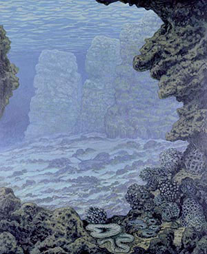 Das Aquarium ähnelt in seinen Gestaltungsmöglichkeiten einem Diorama oder Bühnenbild. Aber auch die Parallelen zum Aufbau eines Gemäldes oder Gartenszenarios in der Komposition von Vorder, -Mittel-und Hintergrund sind frappant. Die optische Täuschung eines gestaffelten Tiefenraumes läßt sich im Aquarium mit einem Dioramakasten aus natürlichen Materialien, einer Phototapete, aber auch mit monochromer oder - Illusionsmalerei hinter dem Becken erzeugen. Kleinplastiken wie Totenköpfe, Ruinen und Schiffsrümpfe ergänzen den Eindruck vom Aufbau eines Bildes. |