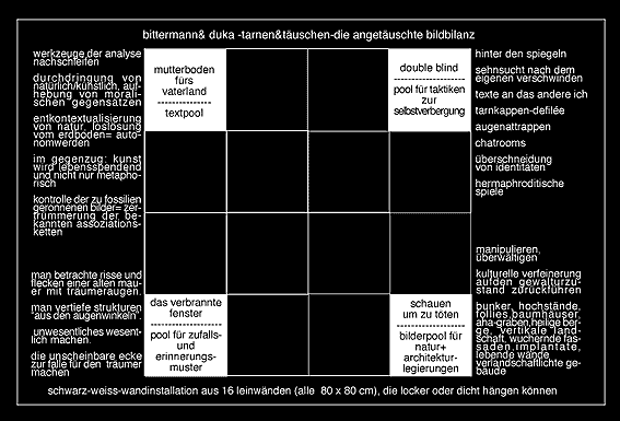 | Peter Arlt/Bittermann & Duka/ifau TARNEN & TÄUSCHEN - Operative Analyse/Getarnte Aktion/Angetäuschte Bildbilanz Konzept zum Workshop "Politische Landschaft", August 2000 www.politische-landschaft.de Angetäuschte Bildbilanz (Bittermann & Duka) ... In Phase 3 heißt es: zurück ins Museum. Hier übernehmen die Künstler der Gruppe die Verantwortung für die "Angetäuschte Bildbilanz". Das Dokumentationsmaterial wird im Museum gesichtet, hinsichtlich seiner im Aktionsprozess entstandenen operativen "Illusionsfaktoren" (= Elemente im Material, die Ansätze zu strategisch vorgetäuschten Räumen und Handlungen enthalten) überprüft und nach künstlerischen, sprich autonomen Kriterien neu formatiert. Das Museum als Haus wird ebenfalls gelesen und seine Lektüre fließt in die Lektüre der verdeckten Aktionen. Einen dritten Faktor bildet die Ausstellung "Radical Architectures", deren Exponate mit in den Akt des Verbildlichens einfließen sollen und darauf einen nicht unwesentlichen formalen Einfluß haben werden. Die Grenze zwischen Kunst und Leben aufzulösen ist einer der stärksten Impulse, die derzeit das Gesicht der Kunstszene prägen. Und doch ist der Kunstkontext immer noch das alles stützende Rückgrat, das die sich ans Leben angleichende Kunst im Zustand der "Tarnung" hält. Um in besonderem Maße der Malerei aus dem Dilemma ihrer vordergründigen Materialfixierung und fehlenden sozialen Dynamik herauszuhelfen, bietet sich ein Ausweg über das Einführen der Achse "Aktion - Darstellung". Auf ihr läßt sich das Spannungsfeld zwischen politischem Handeln und dem Gegenwärtigmachen von Gedachtem, Gefundenem und Erfahrenem in der Malerei ausloten. Auf dieser Achse bildet sich ein Spielfeld, auf dem der Trick des "Antäuschens" zur Metapher für einen spielerischen Wechsel zwischen Ortsbegehungen, sozialen Begegnungen und malereiimmanenten 3D-Raumentscheidungen wird. Hier soll nun ein großes Gemeinschaftsbild entstehen, das sich aus ganz unterschiedlichen Materialien zusammensetzen kann - einem Patchwork vergleichbar. Als Basisausrüstung aber soll klassisches Malerei-Handwerkszeug zum Einsatz kommen wie Leinwand und Farbe oder Wandmalerei, um ein "Tarnmuster" zu erzeugen, das die Ergebnisse der "Operativen Analyse" und der "Getarnten Aktion" dem malerischen Prozess anverwandelt und deren ursprünglich gewollte Formen in eine neue, auf verschiedenen Visualisierungsstufen verknüpfte Landschaft auflöst. |