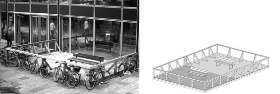 "Tarnen&Täuschen" ist "Manövern" gewidmet, die bestehende Raumgrenzen und Verhaltensmuster anlösen und durch Überlagerung zu neuen Schnittmengen führen. Ort der "Getarnten Aktion" ist der Blumenladen am Haupteingang des Kölner Hauptbahnhofs, von dem im Zuge der Umgestaltung des Bahnhofs nur noch das sockelartige Fundament - eingefasst von einem provisorischen Holzgeländer - übrig geblieben ist. Das Fundament wird spiegelsymmetrisch von der Fassade des Bahnhofs durchschnitten, so daß sich eine jeweils gleichartige Fläche innerhalb und ausserhalb der Bahnhofshalle bildet. An diesem vorgefundenen Ort installierte die "Getarnte Aktion" zwei alte, vom Gartenbauamt überlassene Bänke. Diese waren in Anspielung auf ein Wahlversprechen des neuen Kölner Oberbürgermeisters über 900 neue Sitzbänke jeweils mit einer kleinen Plakette versehen: "Bänke für Köln 1/900", bzw. "... 2/900". Inmitten der Betriebsamkeit des Bahnhofes entsteht damit ein Ort von geradezu idyllischer Abgeschiedenheit, der eine eigene, "dritte" Zeit beinhaltet. Genau auf der Trennlinie zwischen privatisiertem und öffentlichem Raum gelegen, spiegeln sich in der Fassade nicht nur die Bänke und ihre neuen Nutzer, sondern auch verschiedene Formen des Verstehens und Gebrauchens von Stadt: auf der einen Seite die vielgeschmähte "Domplatte" aus den 70er Jahren mit ihren "Stadtbalkonen" und Treppenläufen, auf der anderen Seite die neuen Ladenpassagen des umsatzoptimierten Bahnhofes. |
