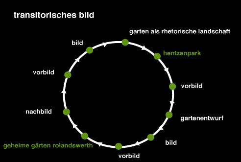 Dieser transitorische Bildbegriff war Auslöser für den Leiter und die Kuratorin (Raimund Stecker und Jutta Mattern) des Arp Museums Bahnhof Rolandseck, uns zur Entwicklung eines Entwurfs zur Verwandlung des "Hentzenparks" in einen "Künstlergarten" aufzufordern. Der "Hentzenpark" war ihnen von den zuständigen Behörden als ein Aktionsfeld für das "Skulpturenufer Remagen" angeboten worden, weil er auch auf Wunsch der Bevölkerung als betretbarer Park wiederbelebt werden soll. Nach dem Abriss der vielbespielten Villa war der "Hentzenpark" fast 30 Jahre lang eine verurwaldete Brache und wilde Müllkippe. Dann wurde sein Unterholz gerodet, und jetzt bietet dieser Zustand die ideale Ausgangssituation für einen neuen Gartenentwurf. Ausgehend von der abstrakten Vorstellung des Gartens als rhetorischer Landschaft wird der "Hentzenpark" für uns aus diesem Grund zum Ausgangspunkt einer bildnerischen und sprachlichen Auseinandersetzung, die ihn zum "Vorbild" für die Darstellung einer möglichen Veränderung des realen Parks im "Bild" macht. Dieses "Bild" soll dann selbst zum "Vorbild" für die Umsetzung der realen "Geheimen Gärten Rolandswerth" werden - wie wir das Gelände nach seiner Fertigstellung nennen möchten. |