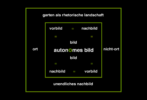 Aber die "Bilder", die wir als Hauptarbeiten für die Präsentation des Gesamtentwurfs entwickelt haben, erfüllen nicht nur die Funktion des "Vorbilds" für einen möglichen Garten, worin sich das Transitorische unseres Bildbegriffs ausdrückt, sondern auch seine Funktionslosigkeit als autonomes Kunstwerk. Man könnte das "Bild" so entkoppelt von allen Bezügen auch als "unendliches Nachbild" bezeichnen. Das "unendliche Nachbild" wird niemals zuende gedacht, weil es alle Formen des "Vorbilds" und "Nachbilds" unauflöslich im "Bild" vereint. Daher ist das dargestellte Naturstück auch losgelöst vom objektiven botanischen Zustand des "Hentzenparks" oder der späteren "Geheimen Gärten Rolandswerth" und könnte an vielen Orten in unseren Breiten zu finden sein. Auf dem "Bild" ist also die Essenz von "Ort" und "Nicht-Ort" zugleich abgebildet. |